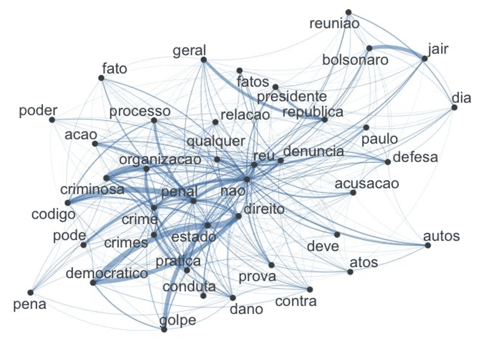 Além disso, há forte presença de nomes próprios e agentes institucionais, como “Torres”, “Ramagem”, “Sergio”, “Netto”, “Alexandre” e “Braga”, que indicam o esforço de reconstruir os vínculos entre os réus e os atos golpistas. Os nomes “Bolsonaro”, “Messias” e “Jair” aparecem com alto grau de conexão, especialmente vinculado a termos como “organização”, “crime”, “eleitoral” e “presidente”.