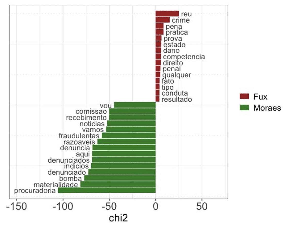 As duas redes deixam claro que os votos não diferem apenas pelo conteúdo da decisão (absolvição ou condenação), mas pela forma como estruturam a própria linguagem. Fux adota um modelo técnico de contenção, Moraes constrói um discurso de responsabilização sistêmica. Esse contraste se aprofunda no gráfico de keyness (teste de qui-quadrado), que mede as palavras mais distintivas de cada ministro (ver Figura 3).