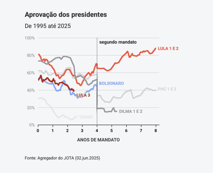 Por que importa: O presidente tem hoje 39% de aprovação no agregador de pesquisas do JOTA (gráfico acima) — um nível que, neste momento, o coloca abaixo da faixa de 50% de probabilidade de reeleição.