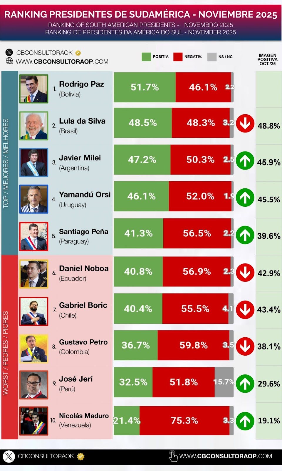 A consultora argentina CB divulgou os resultados de sua nova rodada de pesquisa sobre a imagem dos presidentes na América do Sul em novembro de 2025. O presidente brasileiro Luiz Inácio Lula da Silva (PT), que havia recuperado a liderança no mês anterior, agora aparece em segundo lugar. Mesmo assim, o saldo é favorável para o brasileiro: a desaprovação segue em trajetória descendente.
