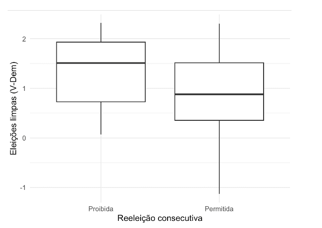 A distribuição desse indicador entre os dois grupos reflete que países nos quais a reeleição consecutiva é proibida são mais bem avaliados por especialistas, em comparação com países nos quais a reeleição consecutiva é permitida.