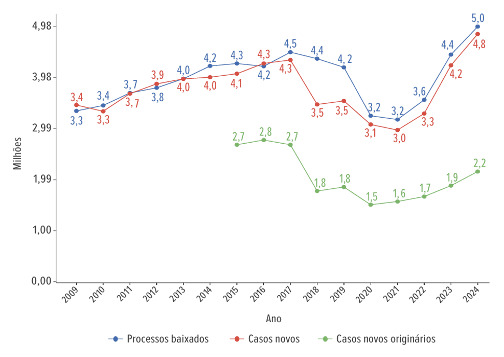 Não à toa, o índice de casos novos na Justiça do Trabalho, que havia caído vertiginosamente entre 2017 e 2018, voltou a subir exponencialmente em 2024, conforme gráfico abaixo extraído do relatório “Justiça em Números” do CNJ.