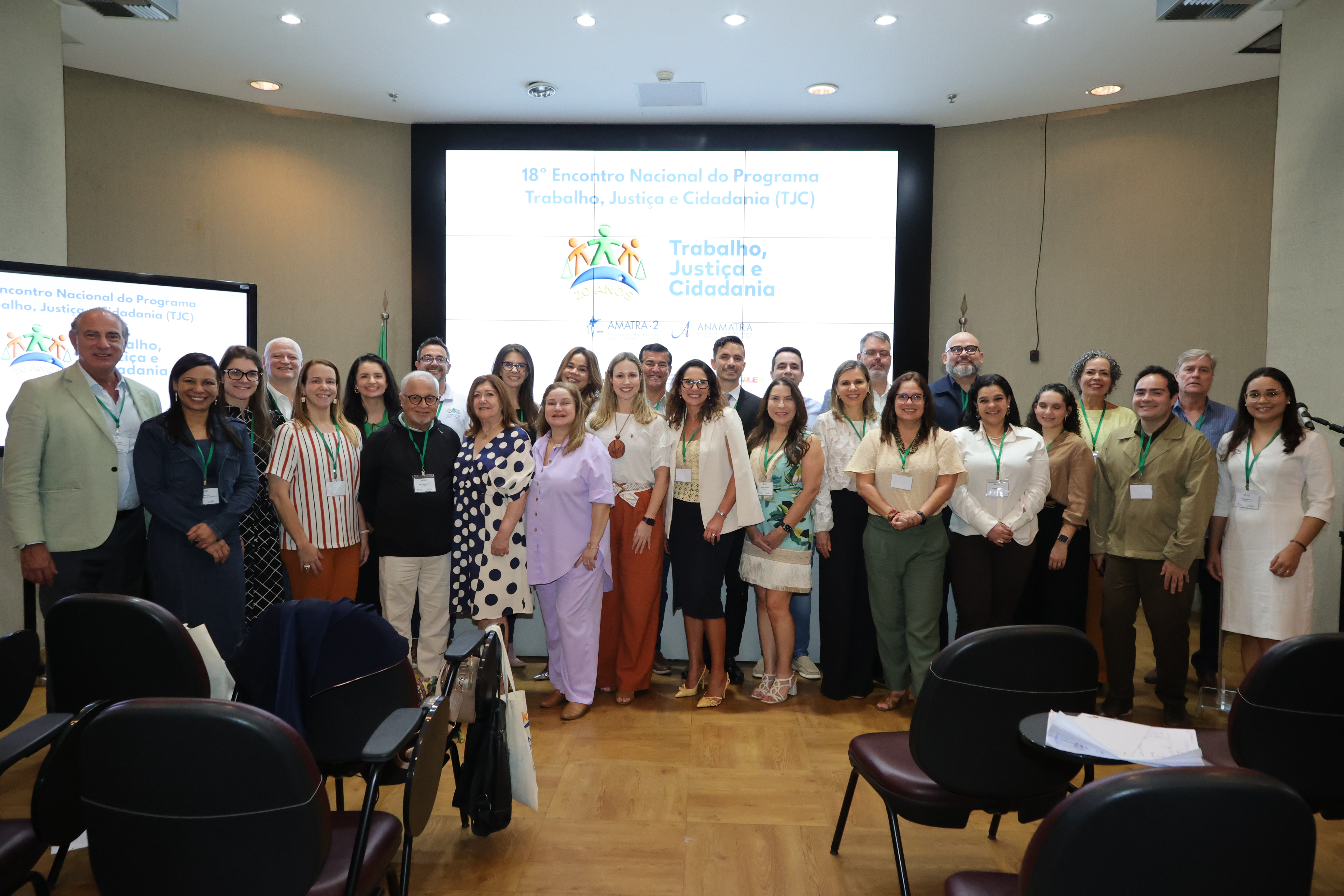 O TRT da 2ª Região sediou, na última semana, o 18º Encontro Nacional do Programa Trabalho, Justiça e Cidadania (TJC). A celebração de mais de duas décadas da iniciativa reuniu coordenadores(as) de todo o país para um intercâmbio de experiências e resultou na cerimônia de encerramento dos alunos das escolas participantes do programa na 2ª Região em 2025. A abertura do evento foi realizada no auditório do 10º andar do Fórum Ruy Barbosa, na Barra Funda, em São Paulo-SP, e contou com a participação de autoridades, magistrados e magistradas.